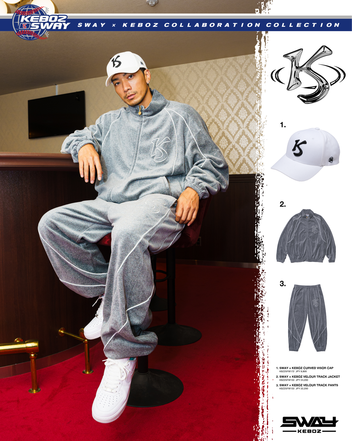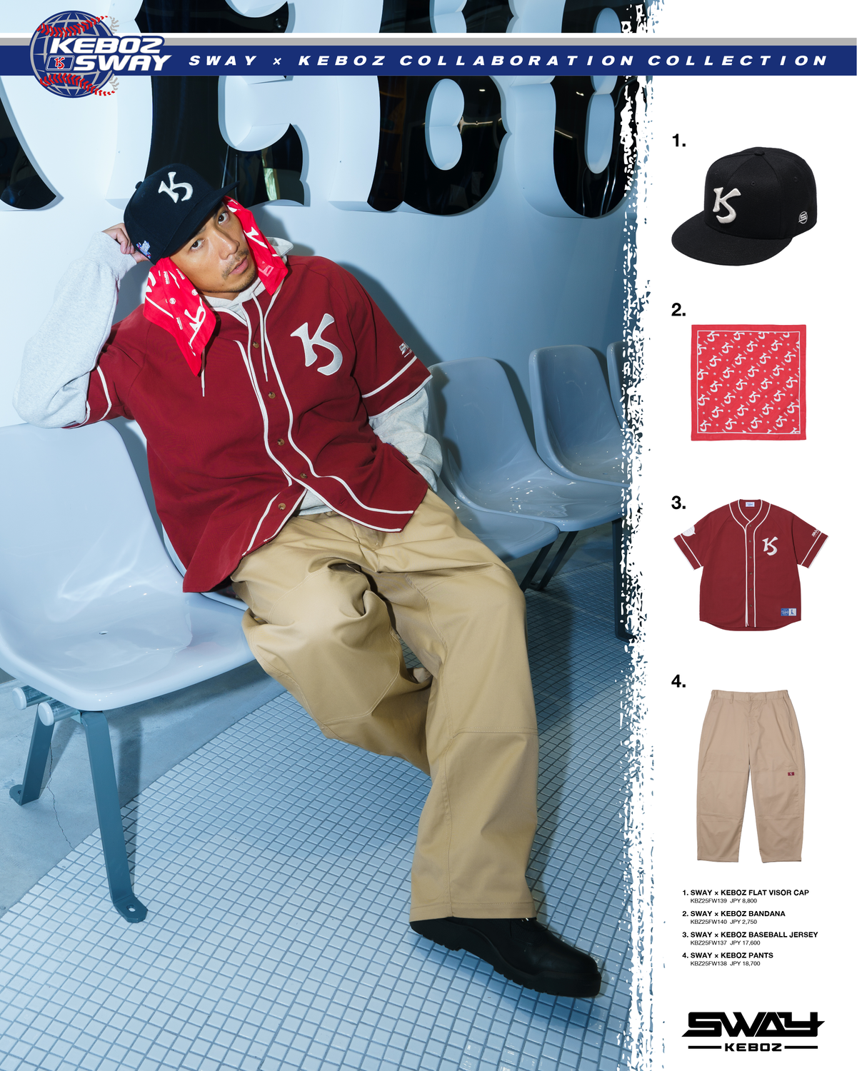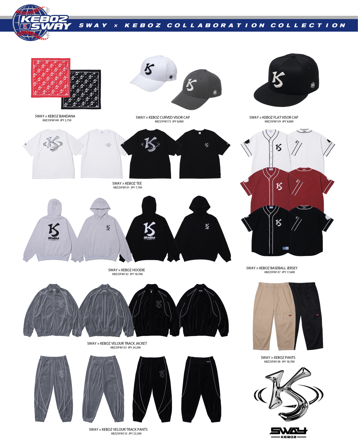 北海道をルーツにもつSWAYとKEBOZがタッグを組み、オリジナルのSK ロゴを軸にベロアセットアップ、ベースボールシャツ、パンツ、スウェットフーディ、Tシャツ、キャップ、バンダナの計9型をラインナップ。